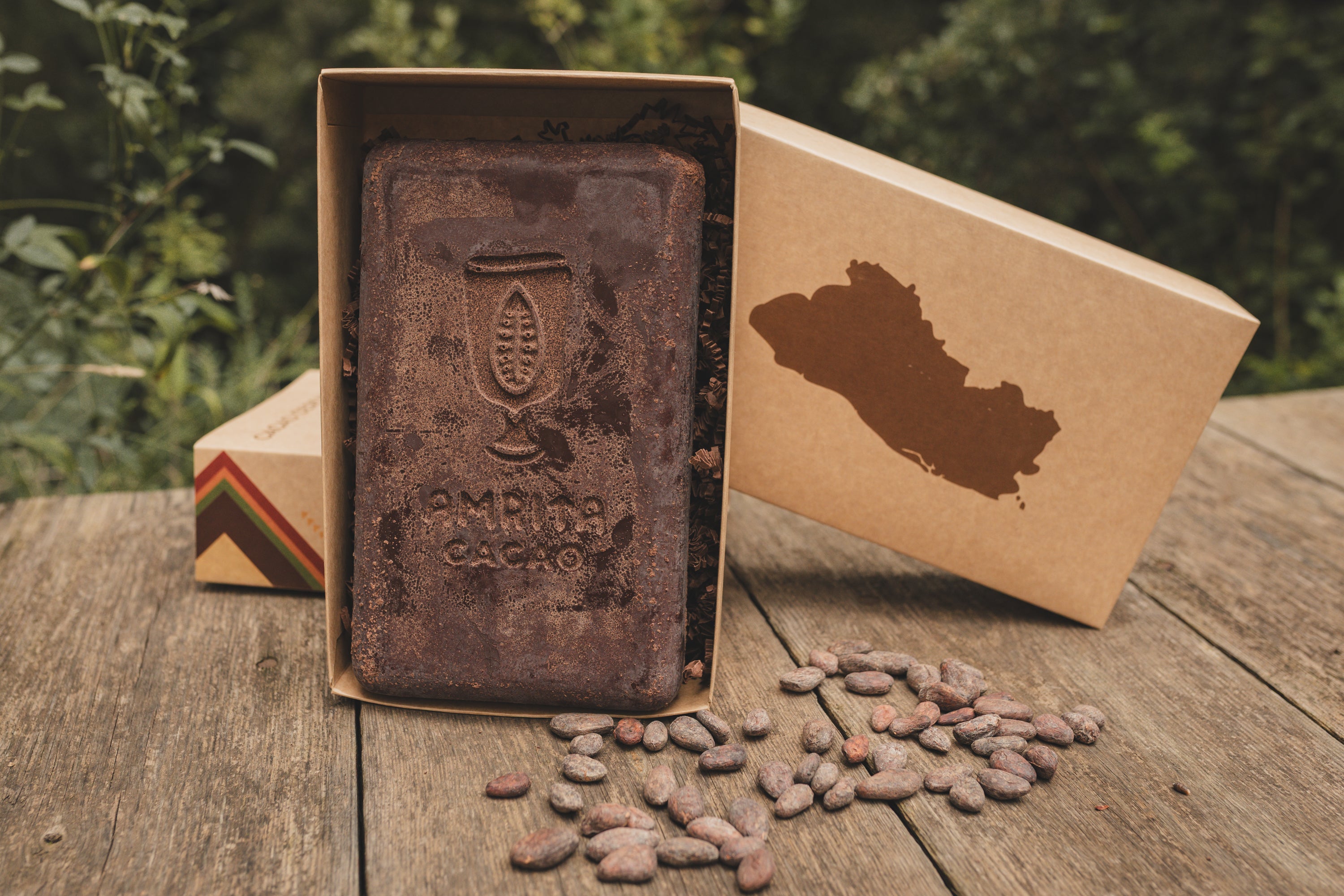 En esta caja de regalo encontrarás 250g de cacao ceremonial de Amrita de Hacienda La Carrera y 100g de té de cacao de Hacienda Comalapa, las dos hermosas fincas en El Salvador con las que trabajamos.